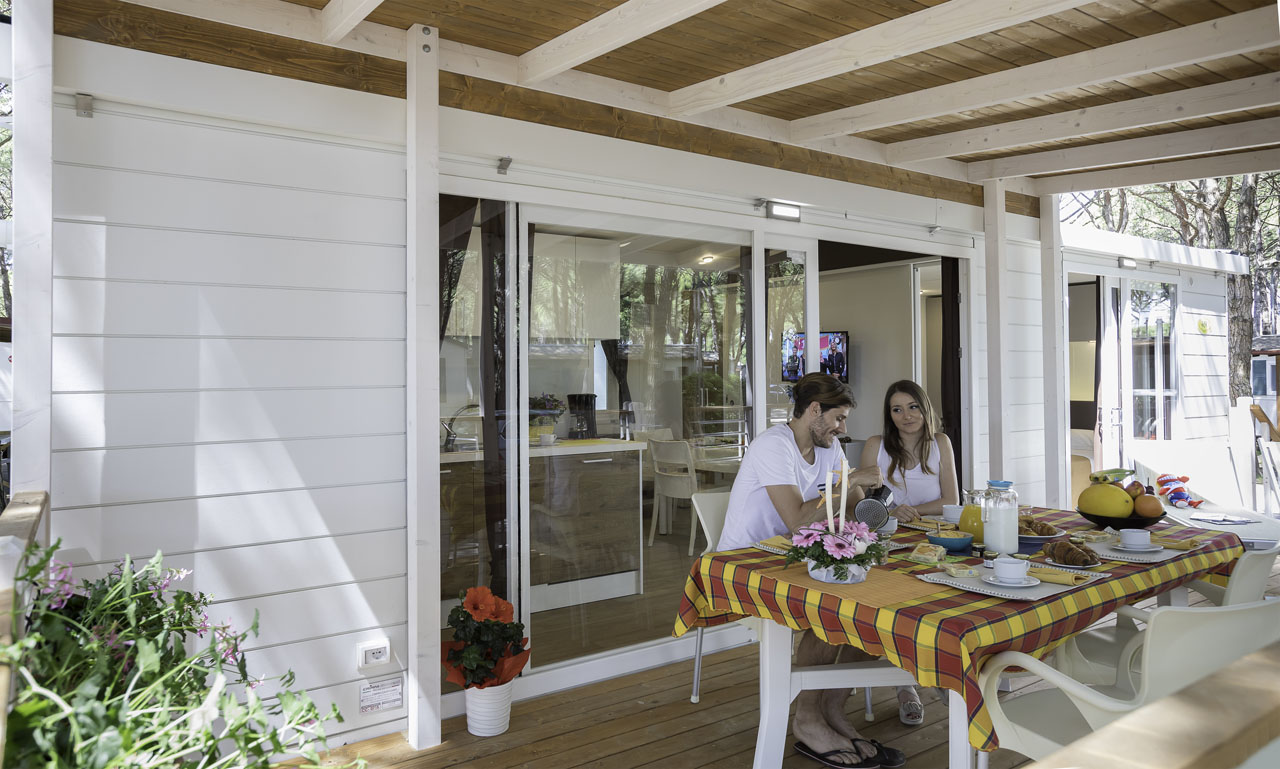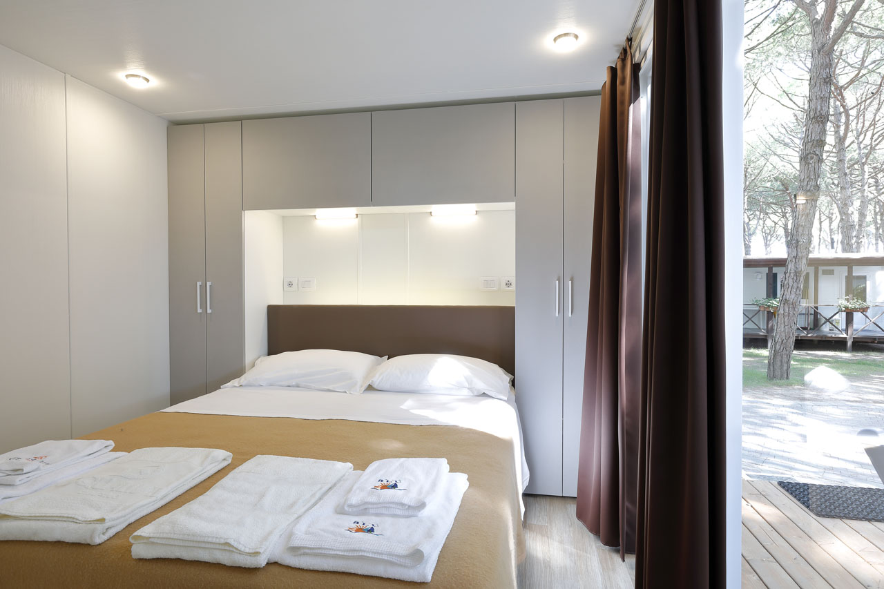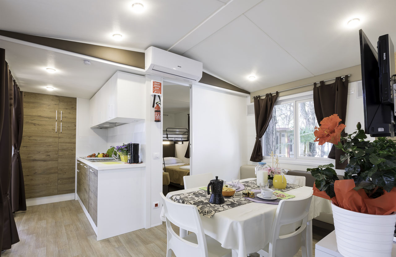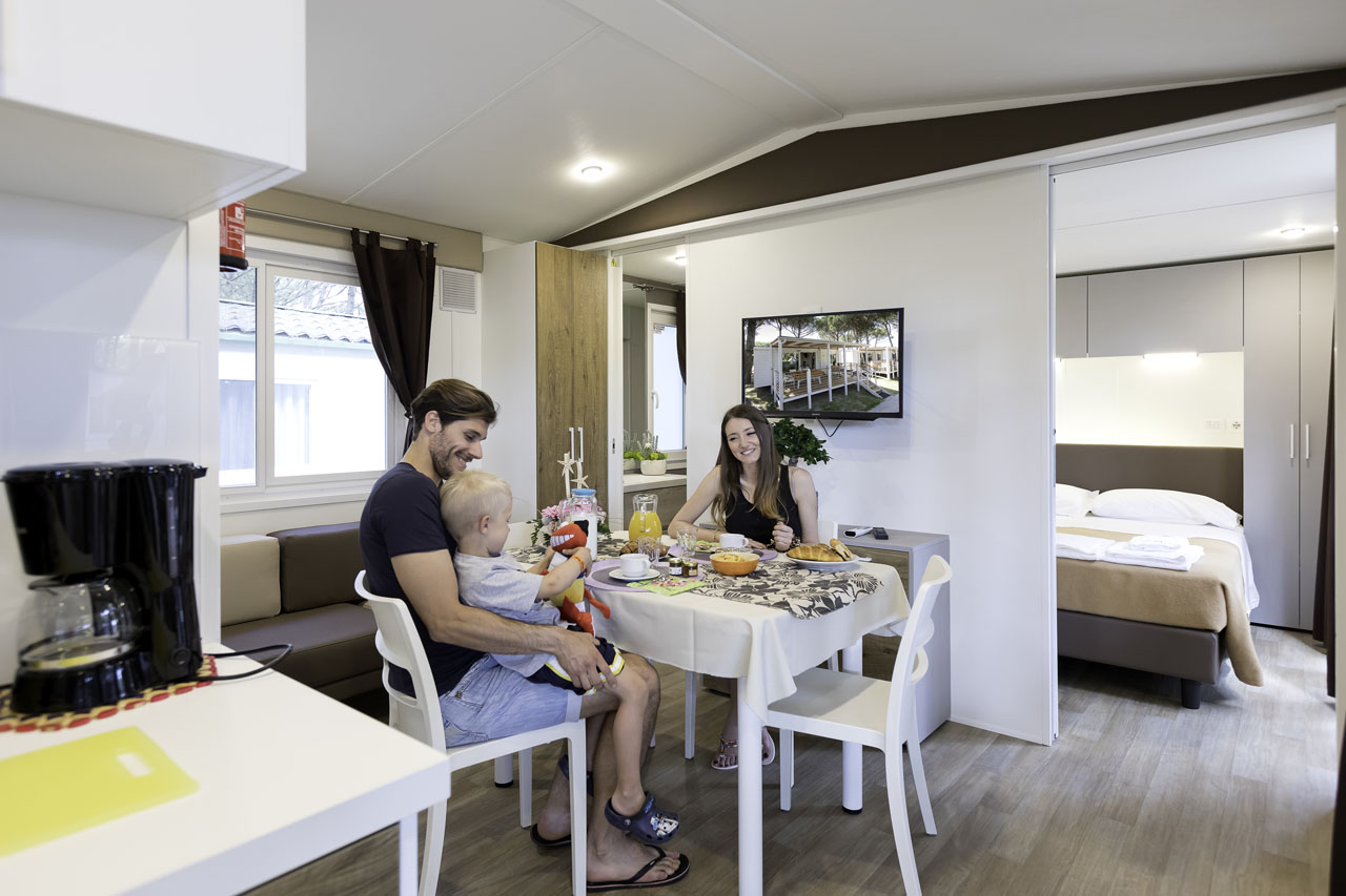 Das Mobilheim Venezia Platinum bietet maximale Benutzerfreundlichkeit in großen Innen- und Außenräumen mit einer Innenfläche von über 34 qm und 22 qm Holzveranda. Es besteht aus zwei Schlafzimmern (ein Doppel- und ein Zweibettzimmer), einer Küche und einem Wohnzimmer und bietet Ihnen den Komfort, zwei Badezimmer zur Verfügung zu haben. Es ist für bis zu fünf Personen ausgelegt. Dieses Mobilheim bietet alle Dienstleistungen und Annehmlichkeiten, um Ihnen einen Urlaub in völliger Entspannung zu ermöglichen und Ihnen gleichzeitig den herrlichen Meerblick zu bieten.