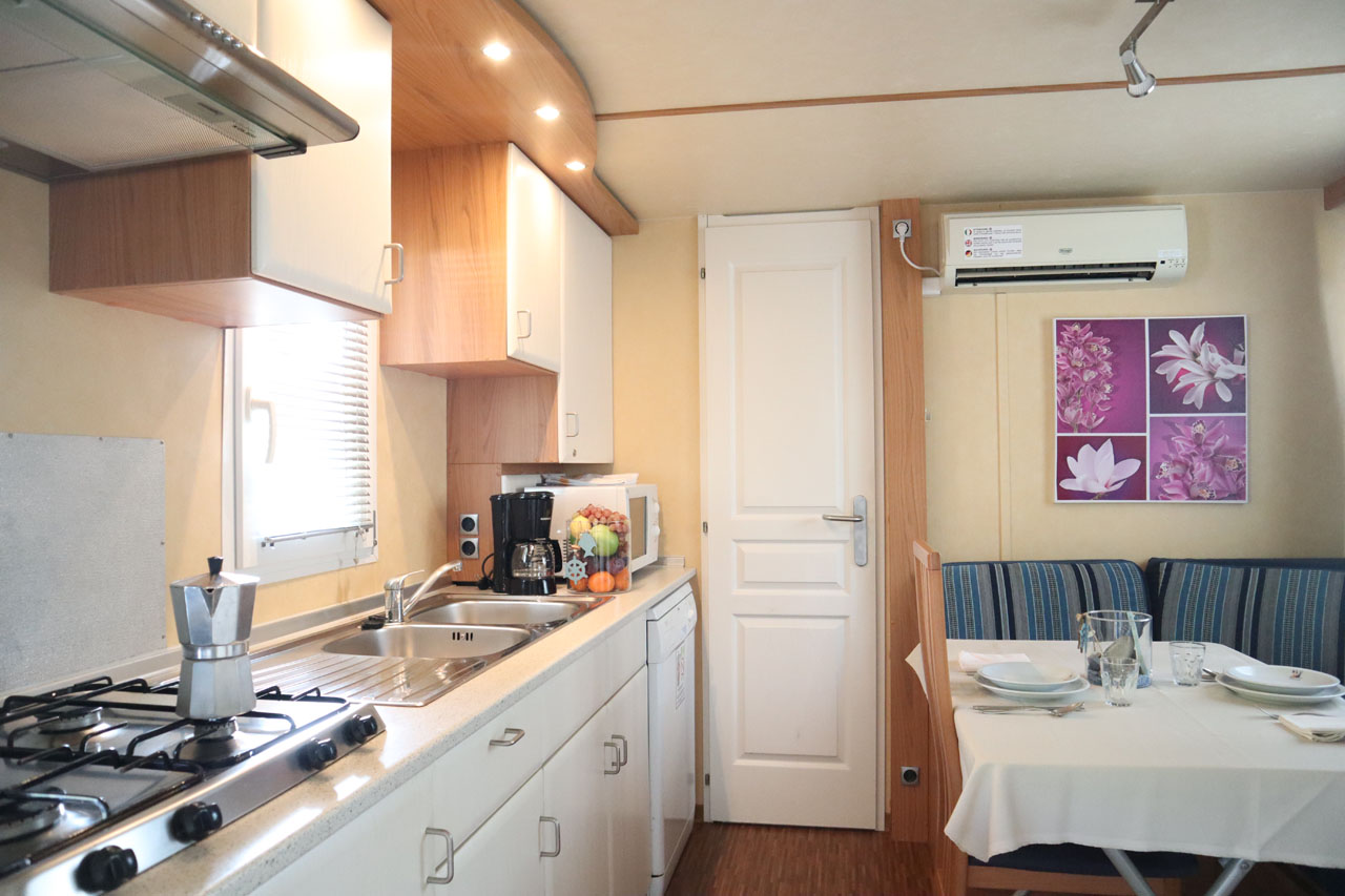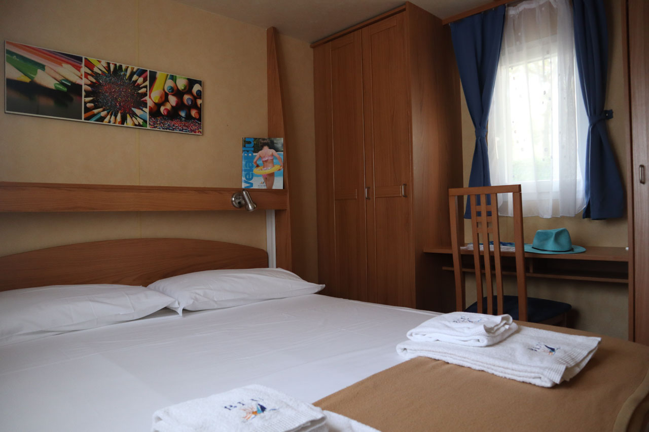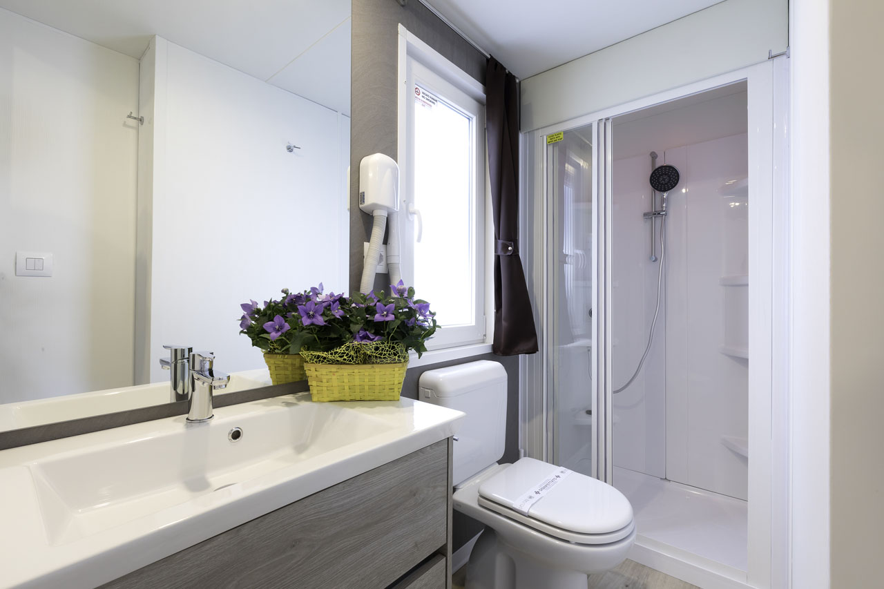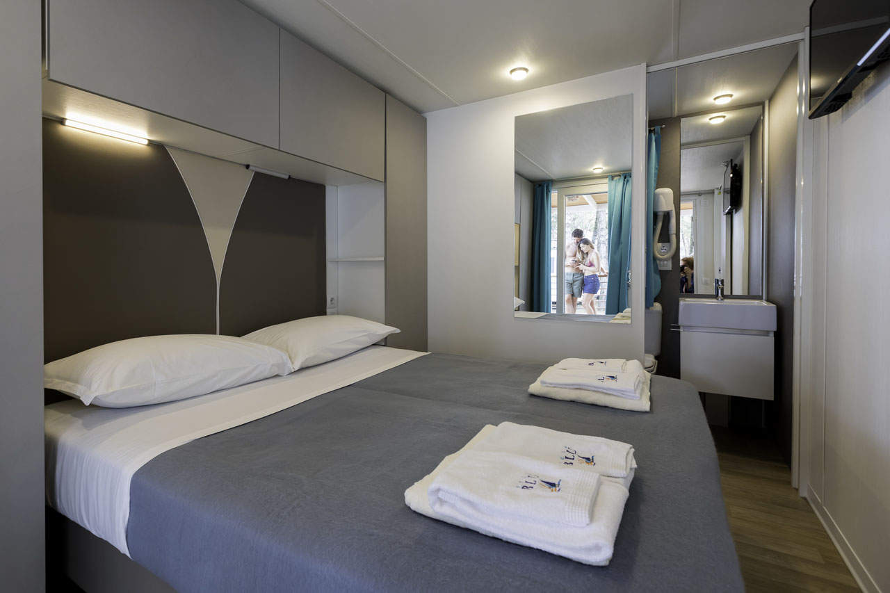 Das Mobilheim Venezia Platinum bietet maximale Benutzerfreundlichkeit in großen Innen- und Außenräumen mit einer Innenfläche von über 34 qm und 22 qm Holzveranda. Es besteht aus zwei Schlafzimmern (ein Doppel- und ein Zweibettzimmer), einer Küche und einem Wohnzimmer und bietet Ihnen den Komfort, zwei Badezimmer zur Verfügung zu haben. Es ist für bis zu fünf Personen ausgelegt. Dieses Mobilheim bietet alle Dienstleistungen und Annehmlichkeiten, um Ihnen einen Urlaub in völliger Entspannung zu ermöglichen und Ihnen gleichzeitig den herrlichen Meerblick zu bieten.
