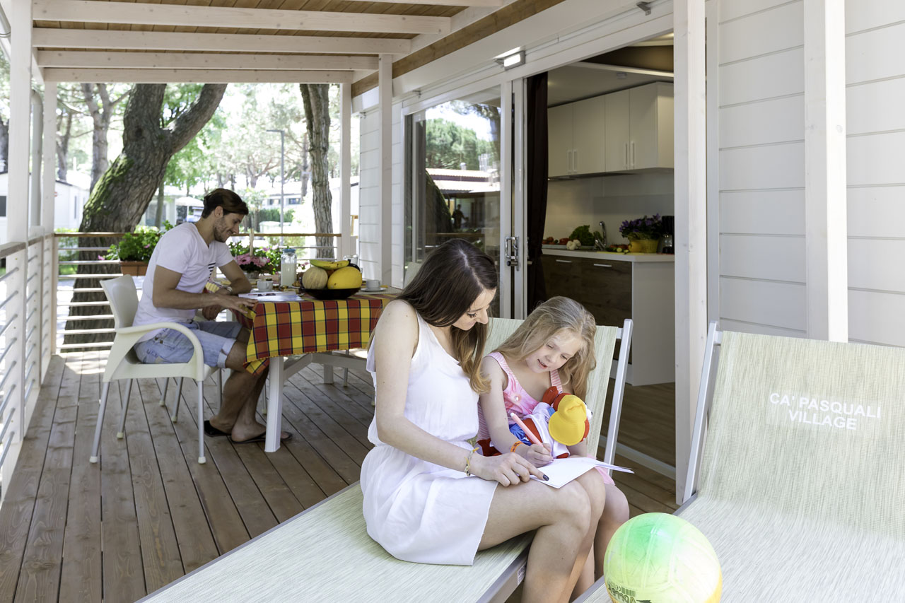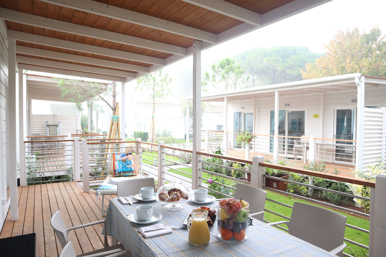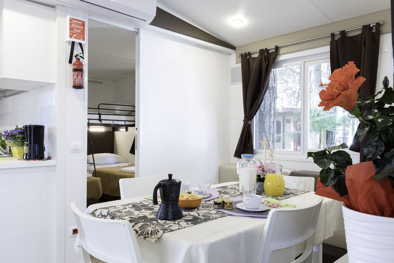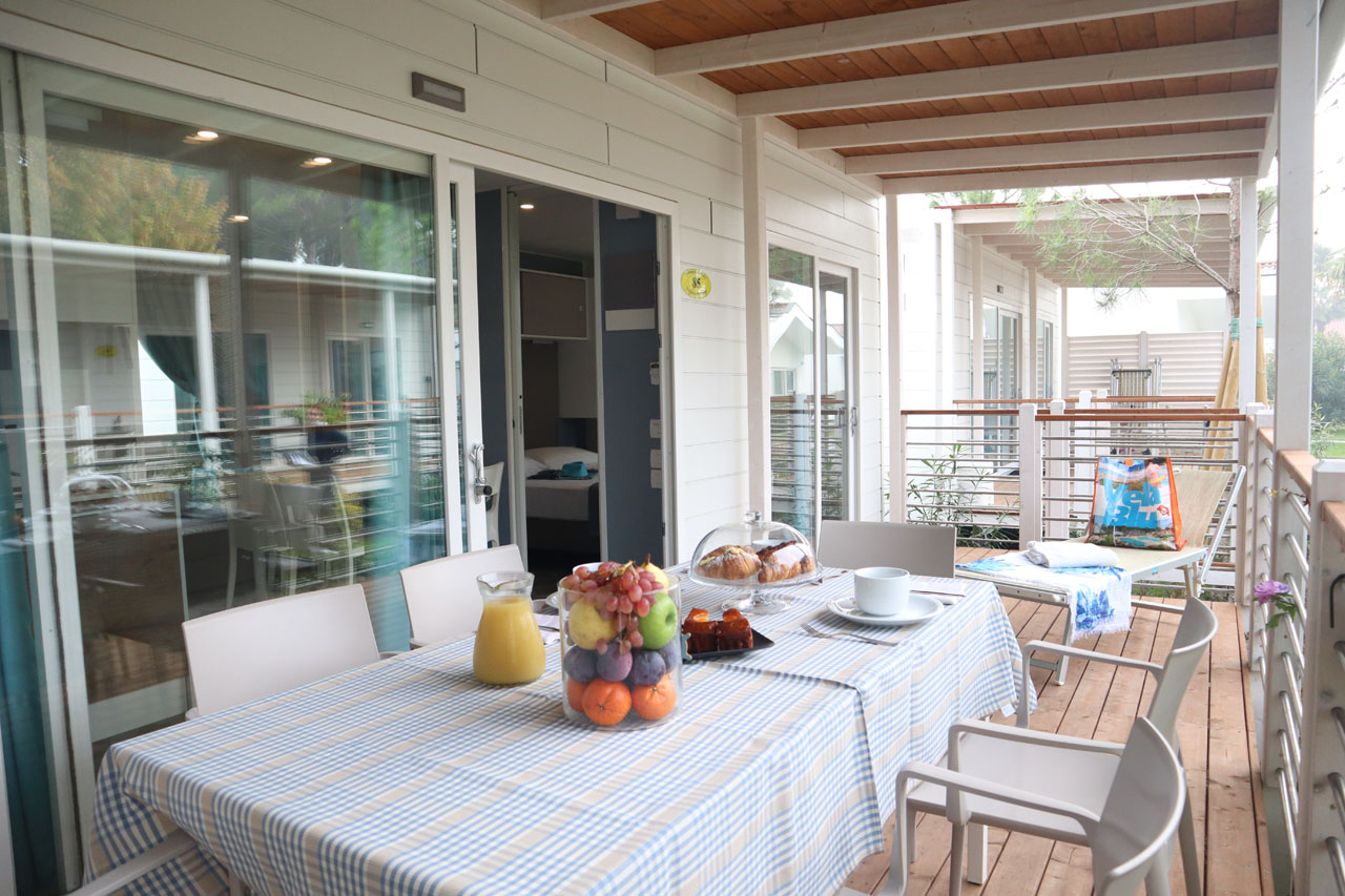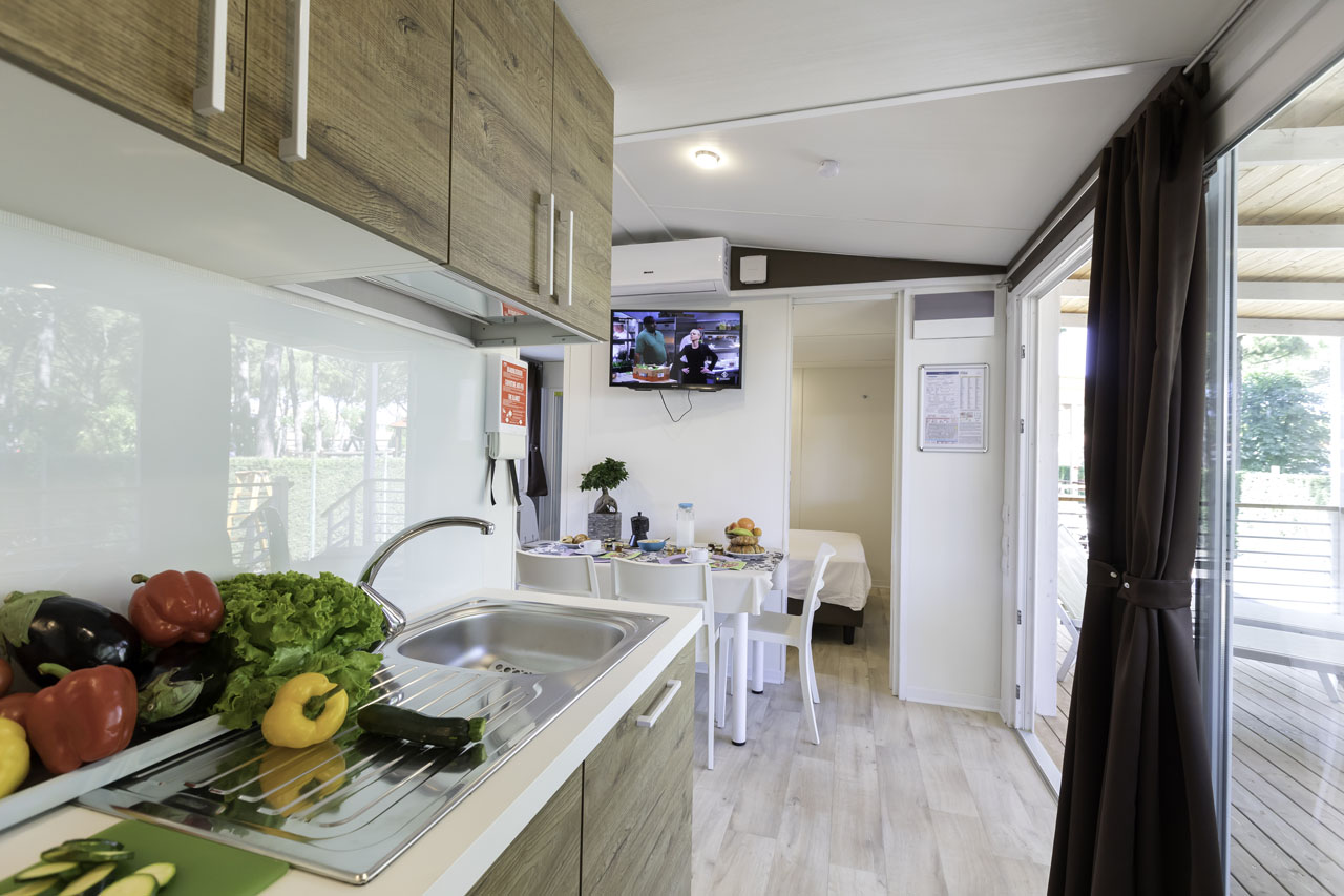 Dieses Mobilheim bevorzugt Innen- und Außenbereiche mit einer Innenfläche von über 29 m2 und einer überdachten Holzveranda von 15m2. Es wurde für fünf Personen entworfen und bietet alle Dienstleistungen und Annehmlichkeiten, um Ihnen einen Traumurlaub in der herrlichen Lage des Vela Blu Camping Village in Cavallino-Treporti zu ermöglichen.