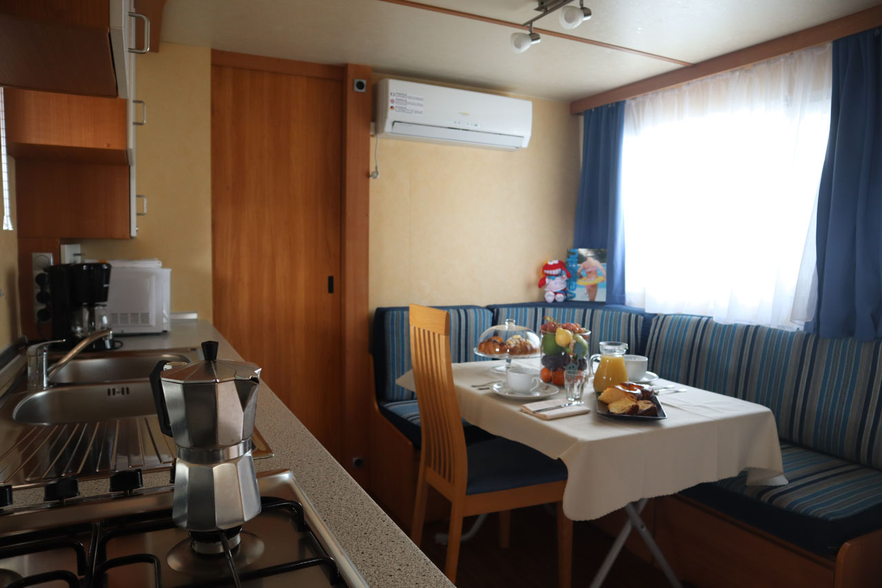 Interne Ausstattung: Klima (kalte / heiße Luft), Moskitonetzen. Großes Wohnzimmer mit Küchenbereich. Küche mit Induktionskochfeld, großer Bestand an Geschirr und Geräten, 200-Liter-Kühlschrank mit Kühlraum, Mikrowelle, Geschirrspüler, Kaffeemaschine mit Filter und Moka. MediaSuite-TV. Schlafzimmer mit zwei Einzelbetten (Betten 200x80) + 3. Hochbeet (190x80). Doppelzimmer (Bett 200x160), mit französischem Fenster, MediaSuite-TV,Schließfach. Badezimmer komplett mit Waschbecken, Toilette, großer Duschkabine, Haartrockner.